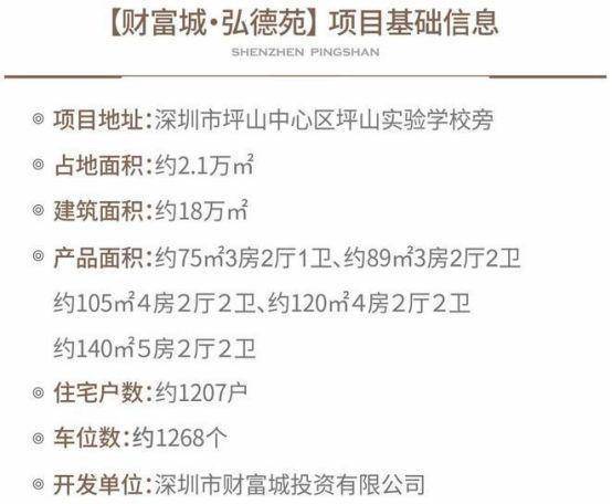 财富城二期(弘德苑)售楼处电话:400 013 9098;开盘时间:2024年11月21日,交房时间:2026年5月1日,占地面积:21643㎡,建筑面积:181058㎡,总房源:1207户,车位比:1:1,共有1268个,主力户型:75-140平3-5房,梯户比:3梯5户,物业管理费:3.9元/㎡/月,物业公司:深圳市财富物业管理有限公司,开发商:深圳市财富城投资有限公司,绿化率:35%,容积率:6.5,位置:位于坪山区高铁新城金丰路与和安路交汇处西侧。