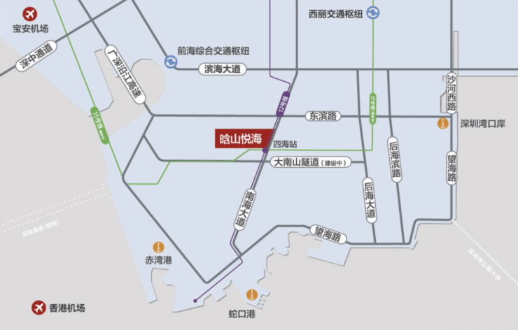 9号线南海大道支线、12号线、15号线四海站。半小时通达深圳机场、前海综合交通枢纽、太子湾邮轮母港以及深圳湾口岸。