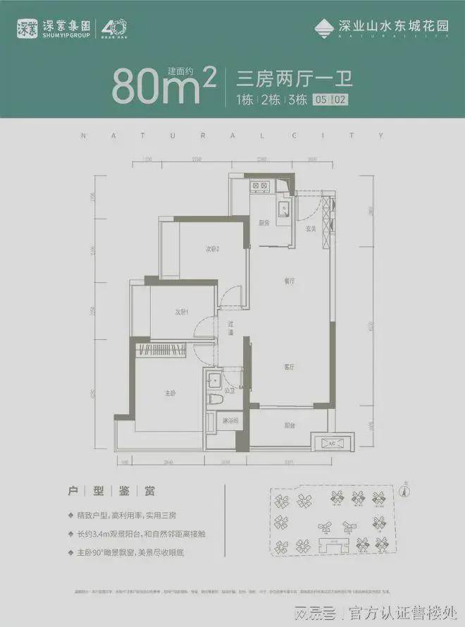 项目分两期开发,一期由8栋楼体构成,其中首批推售产品为1栋1/2/3个单元,主力户型为约80㎡三房一卫、约96㎡三房两卫、约107㎡四房两卫,户型实用率约79%。二期804套约80-107㎡高实用率3-4房,全线配置高品质装修,现楼交付。