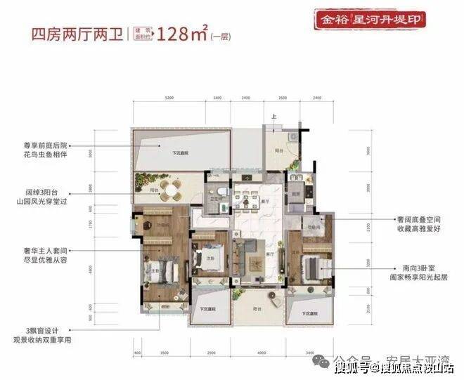 户型方面,主要有两个户型图,其中1层户型建面约130㎡四房,2-4层约125㎡四房。