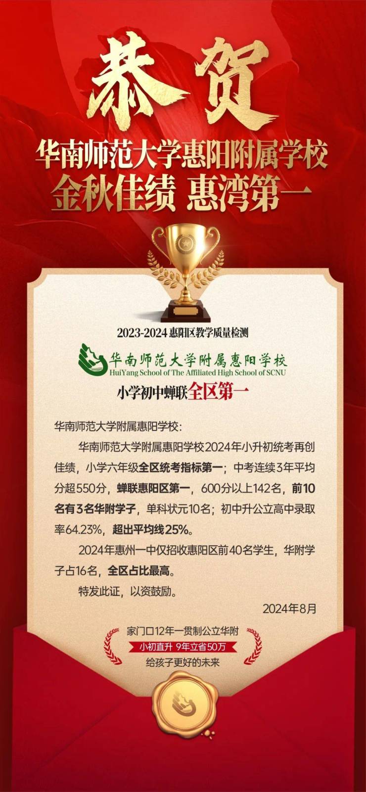 【最强公立小学初中】 家门口12年制公立华附教育,2024年小升初蝉联惠阳第一,连续3年惠湾中考平均分第一;100门特色课,100%编制教师。