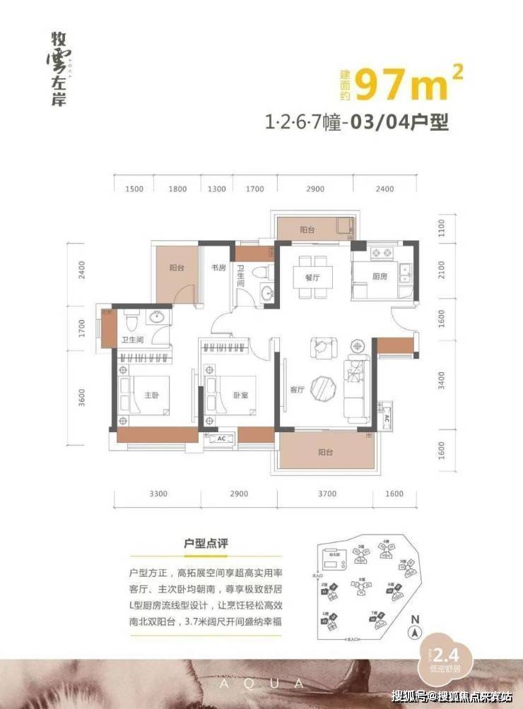 97㎡3房2厅2卫,三阳台,有一个生活小阳台,赠送的小阳台+书房可做儿童房,南北通透双阳台设计且两个卧室朝南还是非常不错的。客厅3.7米,两个卫生间通透性舒适性三房。