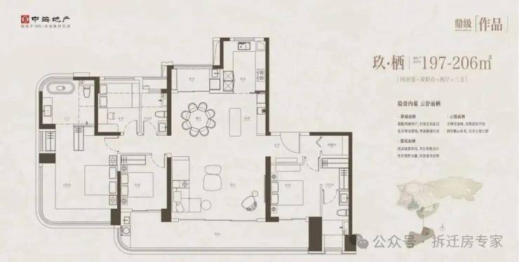 197-206㎡4房3卫:独立电梯入户,中西双厨房,餐客厅一体,双套房设计,端头主卧南北通透,户型方正,四开间朝南,3面采光,整个户型十分通透大气。