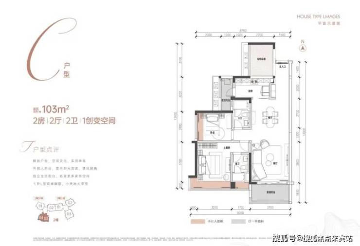 我们先看小面积的建面约103㎡2房+1创变空间。