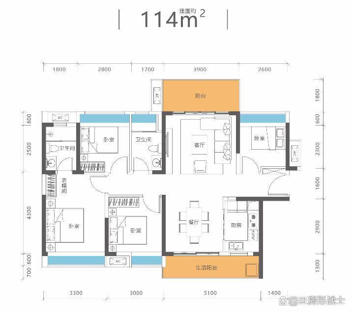 100平3房2卫,