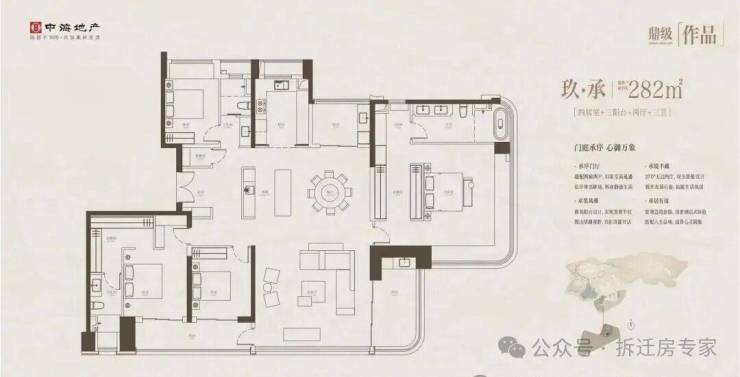 282㎡4房3卫:独立电梯入户,超大南北通一体化客餐厅,三阳台设计,顶级270°景观主卧套房,南向超长全景采光面,户型通透大气。