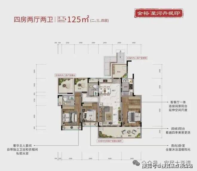 户型方面,主要有两个户型图,其中1层户型建面约130㎡四房,2-4层约125㎡四房。