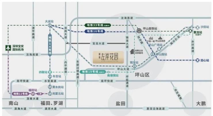 地铁14号线:深圳东部首条地铁快线, 4站大运、12站福田岗厦北。地铁16号线:深圳东部组团线路,快速联通龙岗、坪山。地铁19号线(规划中):坪山首条区内地铁线,项目临近14/19号线换乘站锦龙站,南塘围站。
