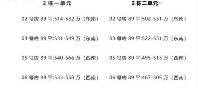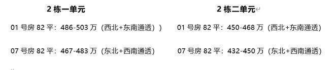 82平米户型2栋一单元和2栋二单元都有分布,两个单元01户型主阳台都是西北朝向,西北+东南通透,07户型主阳台都是东北朝向,东北+西南通透,具体价入如下图。