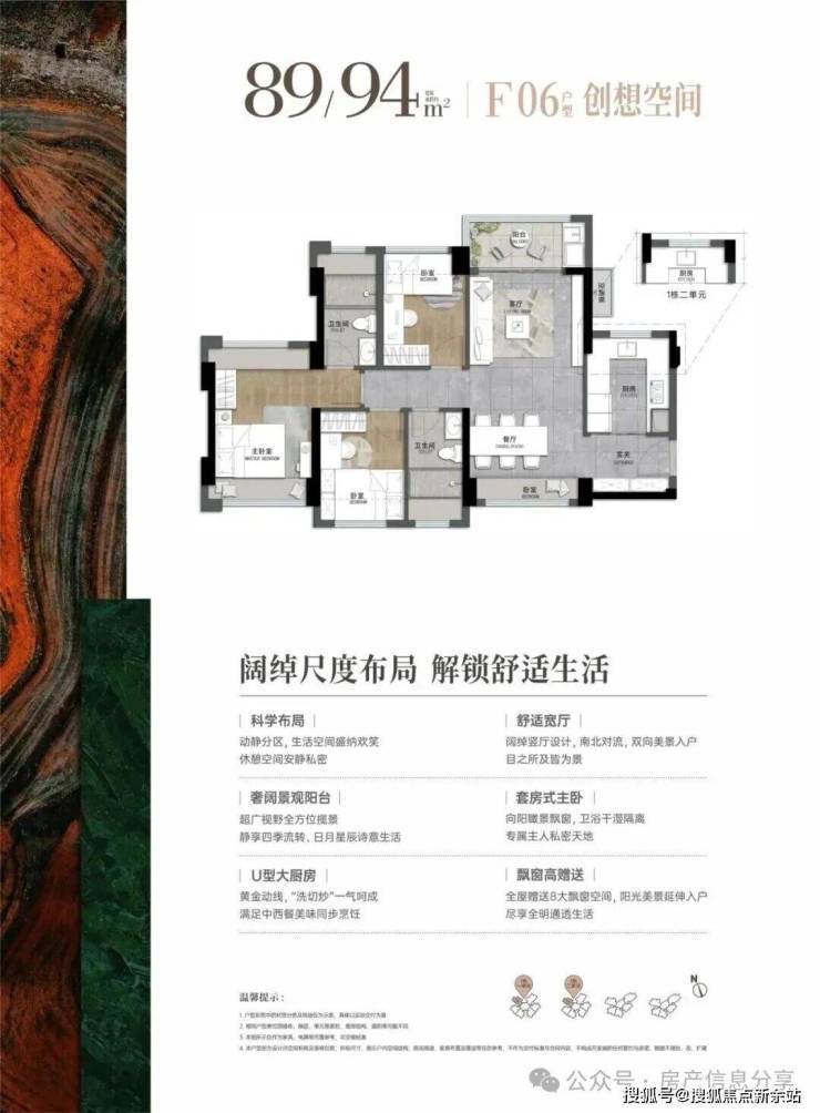 89-94㎡的3房2厅2卫,06户型,设计的是横厅南北通透格局,进门入户玄关,客厅实测3.28米开间,LDB一体化设计,全屋8面飘窗,四开间朝南,主卧南北通套房,3个卧室分别做到了主卧13.65㎡/次卧7.61㎡/次卧7.31㎡(实测面积,不含墙体),U型厨房,卫生间干湿分离,得房率约76-81%(不含赠送),阳台主朝东北向。