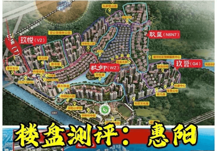 周边配套:项目周边最重要交通配套为惠州南站;此外项目内修建有业主私家登山道,连通亚公顶森林公园;向西约1公里处有天虹商场和大润发,为目前惠阳区较大型商业。