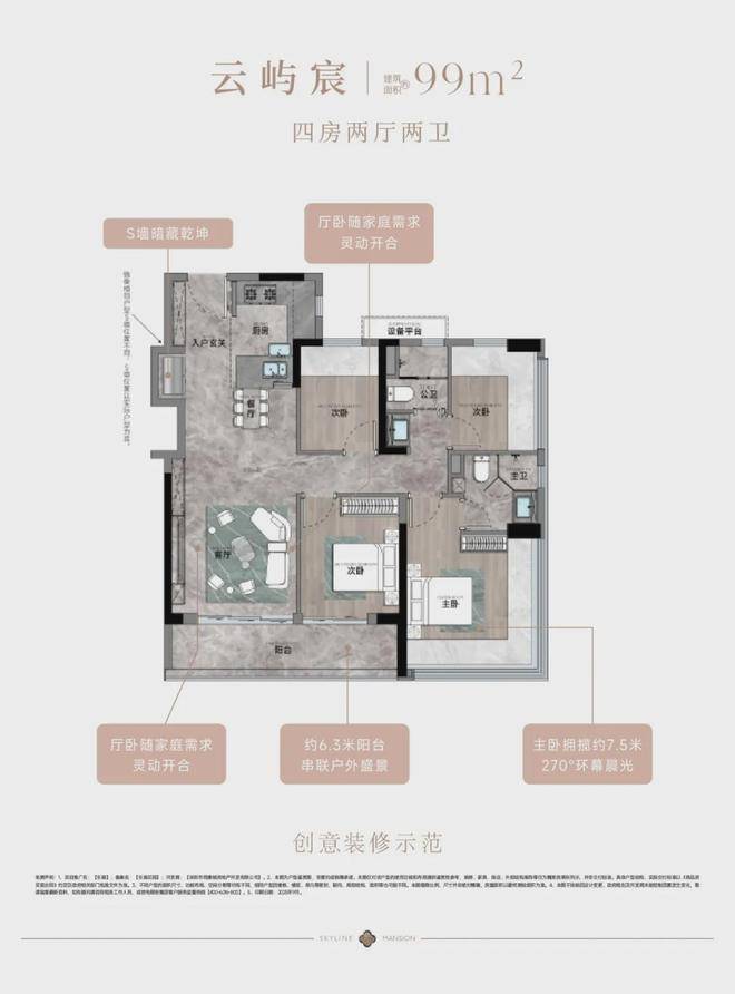 99㎡的4房2厅2卫,设计的是竖厅格局,客厅3.35米开间,LDKB一体化,S墙设计预留双开门冰箱卡槽位,三开间朝南,动静分区,分别做到了主卧15.26㎡/次卧9.57㎡/次卧6.96m²/次卧6.96㎡(包含墙体飘窗),U型厨房,公卫三段式干湿分离,赠送设备平台,得房率约79.5%(不含赠送),套内面积79.29㎡,客厅连接次卧出9.37m²大阳台西南或东南朝向。靓点:99平做到了4房2卫,主卧270°无柱转角飘窗,厨房烟道外置+额外赠送设备平台,并且是纯南向格局。