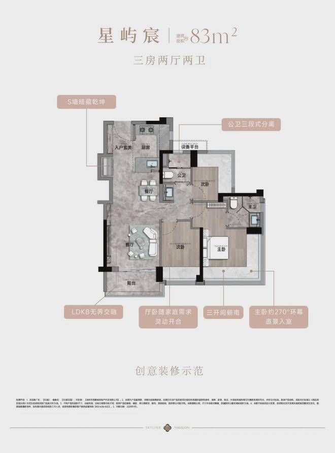 83㎡的3房2厅2卫,设计的是经典竖厅格局,客厅3.35米开间,LDKB一体化,S墙设计预留双开门冰箱卡槽位,三开间朝南,动静分区,分别做到了主卧16.02㎡/次卧9.08㎡/次卧7.01㎡(包含墙体飘窗),U型厨房,公卫三段式干湿分离,赠送1.98平设备平台,得房率约77.9%(不含赠送),套内面积64.28㎡,阳台5.02m²西南或东南朝向。靓点:83平做到了3房2卫,主卧270°无柱转角飘窗,厨房烟道外置+额外赠送设备平台,并且是纯南向格局。
