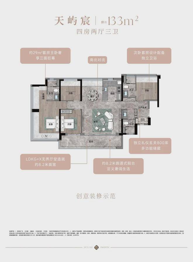 133㎡的4房2厅3卫,设计的是竖厅南北通透格局,进门入户玄关,客厅5.4米开间,餐客厅分离设计,分别做到了主卧24.5㎡/次卧10.2㎡/次卧8.96㎡/次卧7.84㎡(实测面积),客厅连接次卧出12.3m²的观景大阳台,L型中式+岛台灵动式厨房,公卫三段式干湿分离,得房率约79.5%(不含赠送),套内面积105.78㎡,阳台主朝东南或西南向。靓点:超大客餐厅南北对流+8.2米长超大观景南向阳台,超大主卧+270°无柱转角飘窗+进门独立玄关800库。