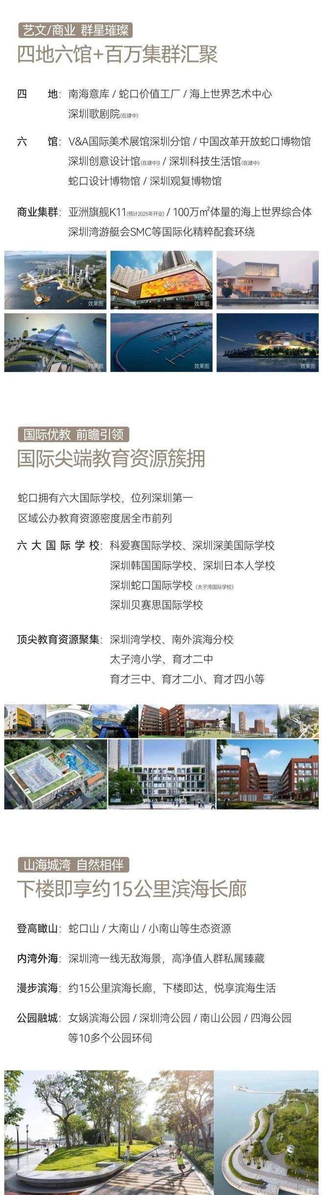 地处前海蛇口自贸区,毗邻香港,拥有得天独厚的地理位置。项目周边交通网络发达,通过望海路、南海大道、后海大道等城市干道及地铁2号线东角头站,与周边区域建立便捷的外部交通联系。此外,项目还临近太子湾邮轮母港,可快速辐射深圳国际机场、香港国际机场等城市核心交通要塞。自带约5 m² 万的商业设施,由华润运营。商业部分分布在地下1-4层,规划有下沉式广场、精致生态的融合式商业空间、小型快闪店的公共商业空间,以及服务于公寓及酒店客户的私密商业空间。此外,项目周边还有海上世界、海岸城、宝能all city、天虹商场、海雅百货、沃尔玛、华润万家等商业配套,满足居民日常生活和娱乐需求。周边教育资源丰富,包括半岛第二幼儿园、南海玫瑰为明幼儿园、双玺幼儿园、蛇口幼儿园、半岛第三幼儿园等。此外,项目还与南山外国语学校(集团)滨海学校、太子湾学校等优质教育资源相邻。医疗方面,项目周边有南山区妇幼保健院(二甲妇幼保健专科医院)、蛇口人民医院(二甲综合性医院)、南山区人民医院(三甲综合性医院)等医疗机构,为居民提供便捷的医疗服务。