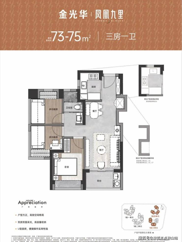金光华凤凰九里开盘时间为2023年11月,推出1栋1/3单元,共430套房源,面积68-106㎡,2-4房,金光华凤凰九里得房率达到80%,加上赠送面积约90%,还是很不错的,目前在售产品折后总价区间,67m²2房1卫:215-238万,74m²3房1卫:230-259万,85m²3房2卫:270-318万,106m²4房2卫:350-425万,67平米两房0首付5万定金即可上车,月供30年8900左右每个月!74平米0首付定金5万三房月供9800上车