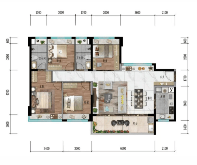 『南北通透双阳台 南向四开间』:118㎡户型 四房两厅两卫