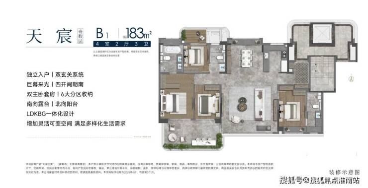 洋房B1户型建面约183㎡,4房2厅3卫,四开间朝南,双主卧套房,六大分区,LDKBG一体化设计,满足多样化生活需求。