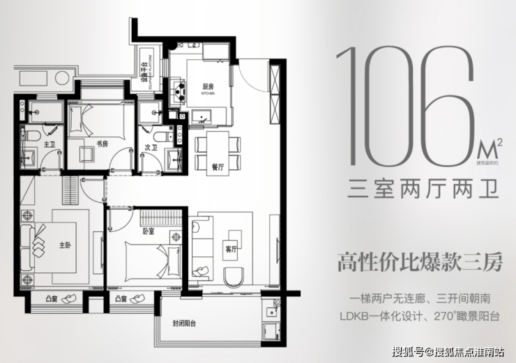 建面约106㎡3房:无连廊,高得房率!