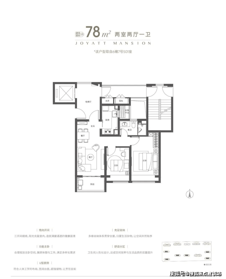 这是建面约76㎡户型的样板间,三开间朝南、双卧室朝南,南向面宽约11米。