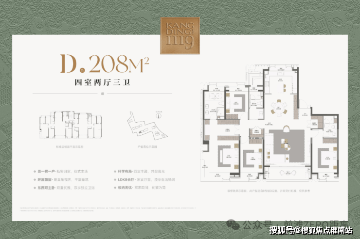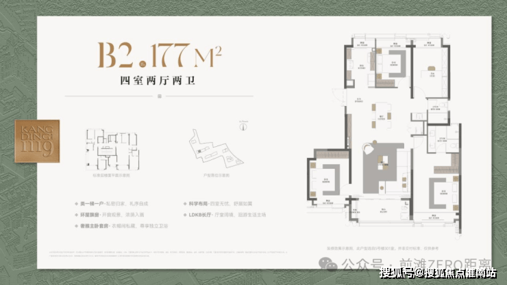 建面约 177-183㎡四房:项目主力户型,采用 LDKB 一体化横厅设计,部分配备双套房,得房率高达 89.6%。
