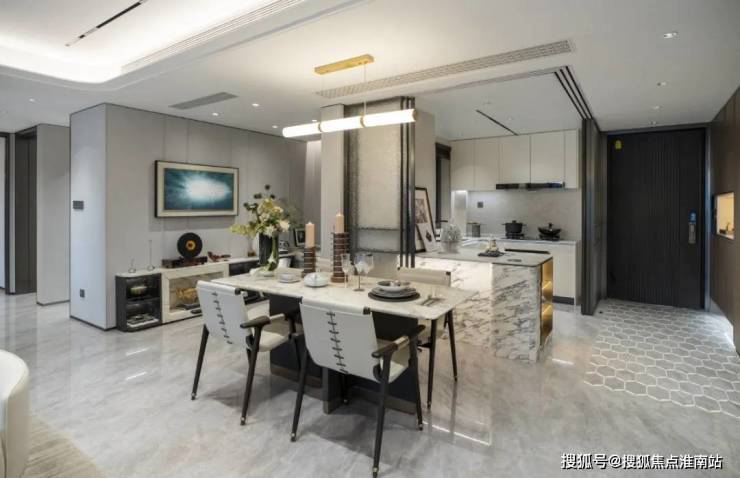 整体装修材料使用也有讲究,厨房是三折玻璃门的设计,开放与隔断自由变换。岛台采用高端大理石和凝脂玉发光石材、主卧套房内的香格里拉白奢石,石材的大量运用会为生活更添厚度与质感。