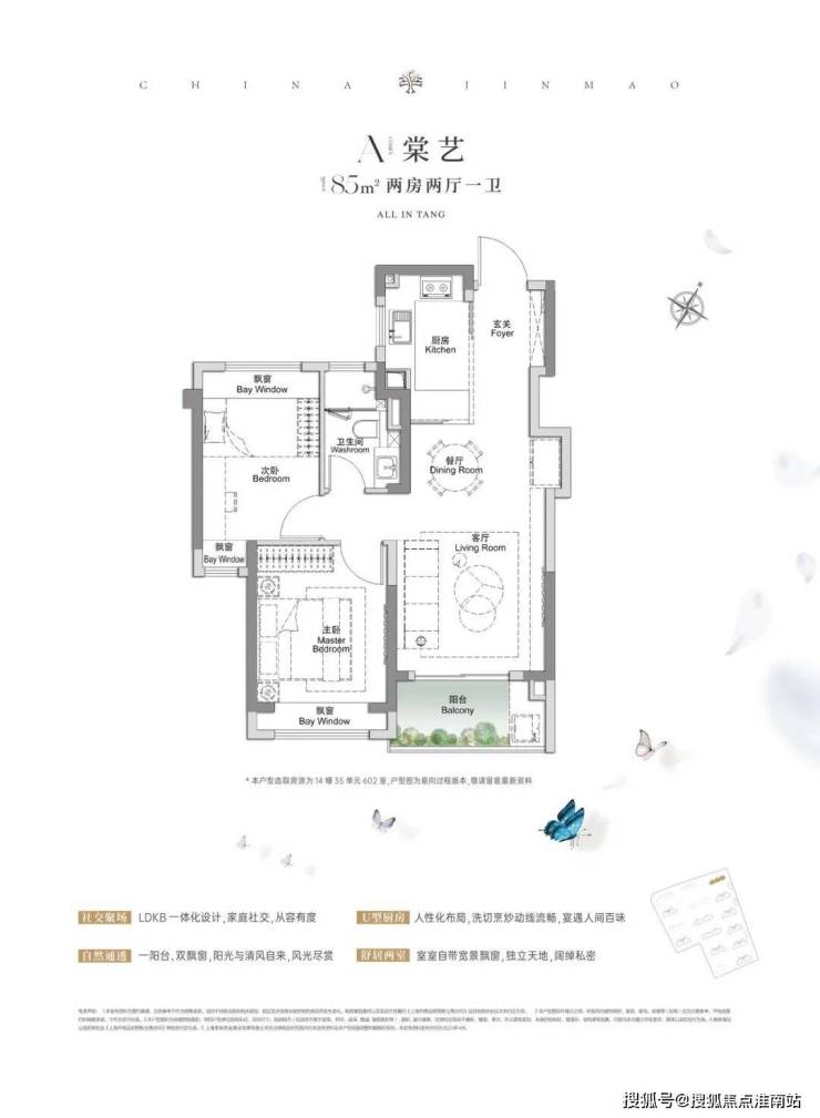 建面约85㎡2房1卫,双开间朝南+3飘窗设计;