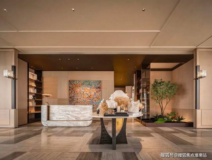 走近门庭, 三重弧形石材背景墙+圆角幻彩穿孔顶,搭配潺潺流动的 中央水景,营造出星级酒店般的尊贵仪式感。