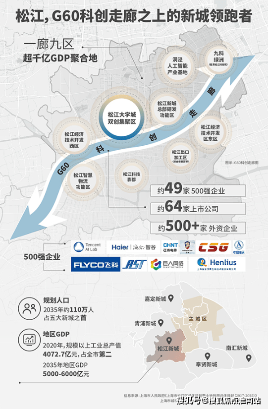 G60科创走廊是松江的名片,集聚了近50家世界500强、约64家上市公司、约500+家外资企业,贡献了松江约90%的工业产值,占上海工业产值近10%(来源上海松江)。