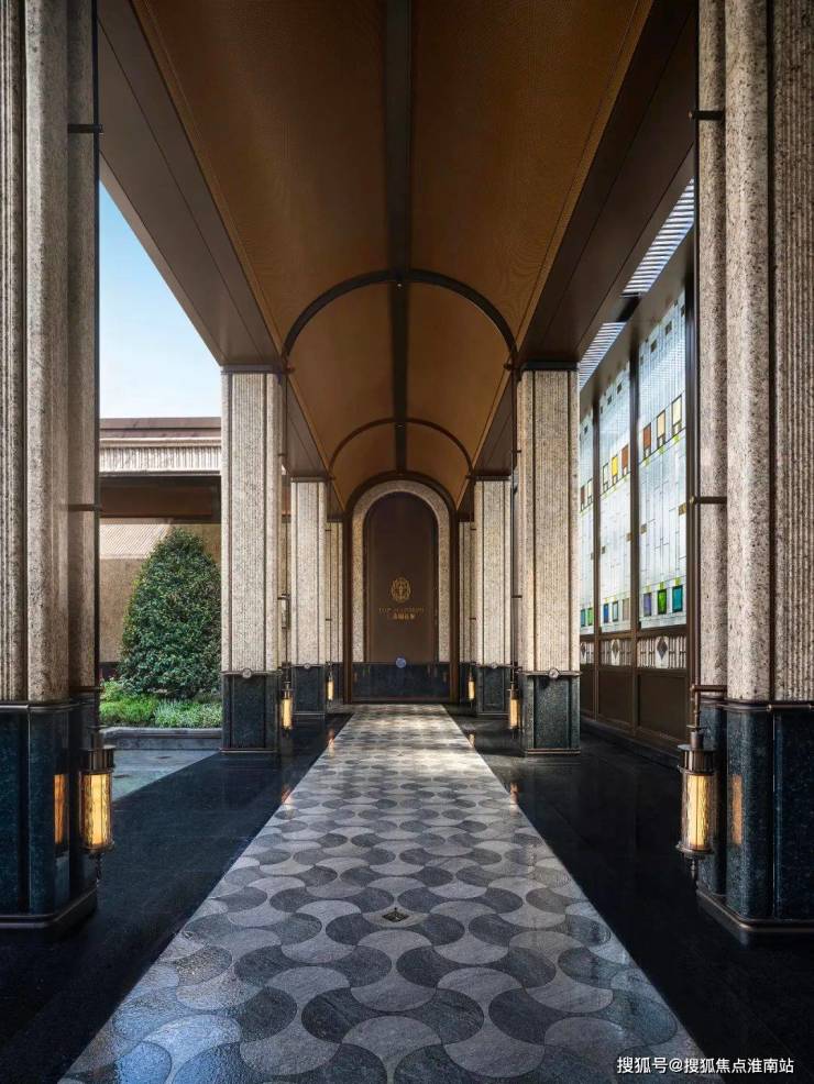 其次,项目的很多细节都融入了海派经典元素,比如落客区美轮美奂的约300㎡彩色玻璃穹顶,艺术连廊拱形廊道灵感都来自和平饭店。彩绘花窗的拱门造型则取自武康大楼。