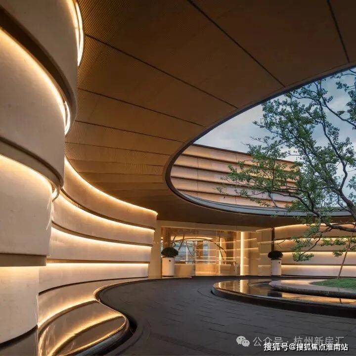 因项目整体抬高,从下沉庭院到架空层“空中花园”的落差极大,形成独特的峡谷地貌,杭序府的设计团队汲取九溪烟树为造园灵感,打造一个立体多维的城市溪谷交互园林;因项目毗邻江岸,杭序府的外立面以“站立的江潮”为灵感,