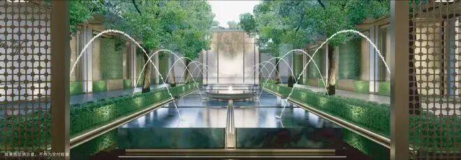 将东方园林造景的意境与意大利海派风格相融,中轴对称,融入苏州传统游廊,以两轴两园三进礼序,打造高奢酒店式艺术生活园境,形成热闹城市生活到静谧苏式园林的场景转换。