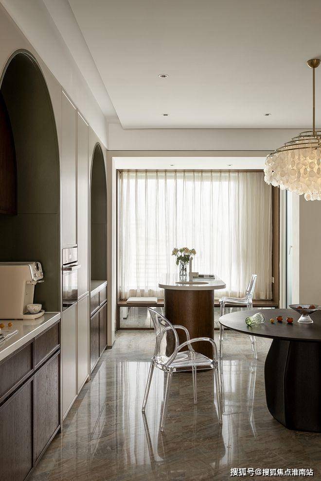 厨餐厅,内置双拱门造型,利用空间穿插、错景,划分餐厅与西厨区,开放互动气质与当代审美相结合,隔而不断,界而未界,留给空间更多的想象和延伸。