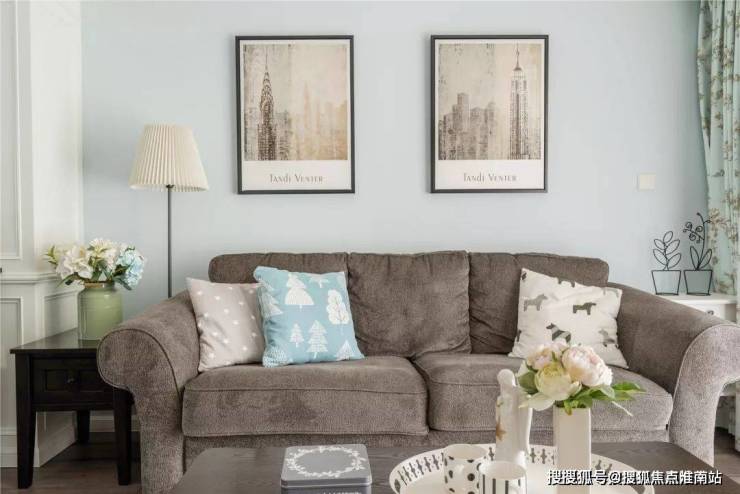 ▲ 浅蓝色的沙发墙搭配素朴的软装,窗边是一款浅绿色的碎花窗帘,整体营造了恬静优雅的客厅氛围。龙珠公寓