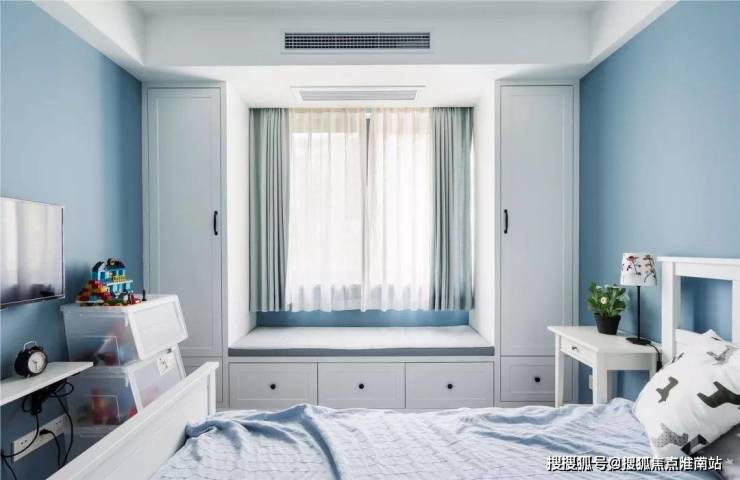 ▲ 浅蓝的墙面营造了清新基调,加以白色的家具进行搭配,赋予了主卧空间简单明快的休憩氛围。