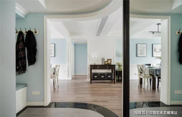 ▲ 浅蓝色墙面采用了护墙板设计,配合墙面三幅简约黑白装饰画,轻快大方的优雅感十足。龙珠公寓