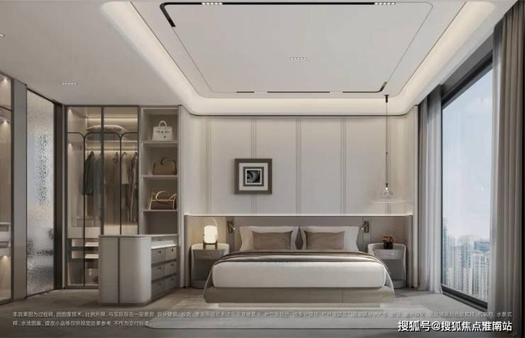 主卧套房设计,收纳空间非常足,鱼骨纹的实木复合地板,后期还会升级;吊顶也是和客厅一样的悬浮弧形吊顶,主卧没有飘窗,但是有几乎是一整面的落地窗,采光效果可以想见会非常好。