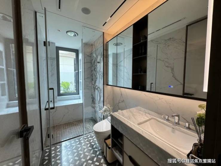 两个卫生间都是通长镜柜,带除雾功能,高仪台盆,智能马桶+冲洗器,隐藏式地漏,全部岩板墙面;主卫镜柜还多一个美妆冰箱,淋浴区还是采用五星级酒店的那种顶喷设计。