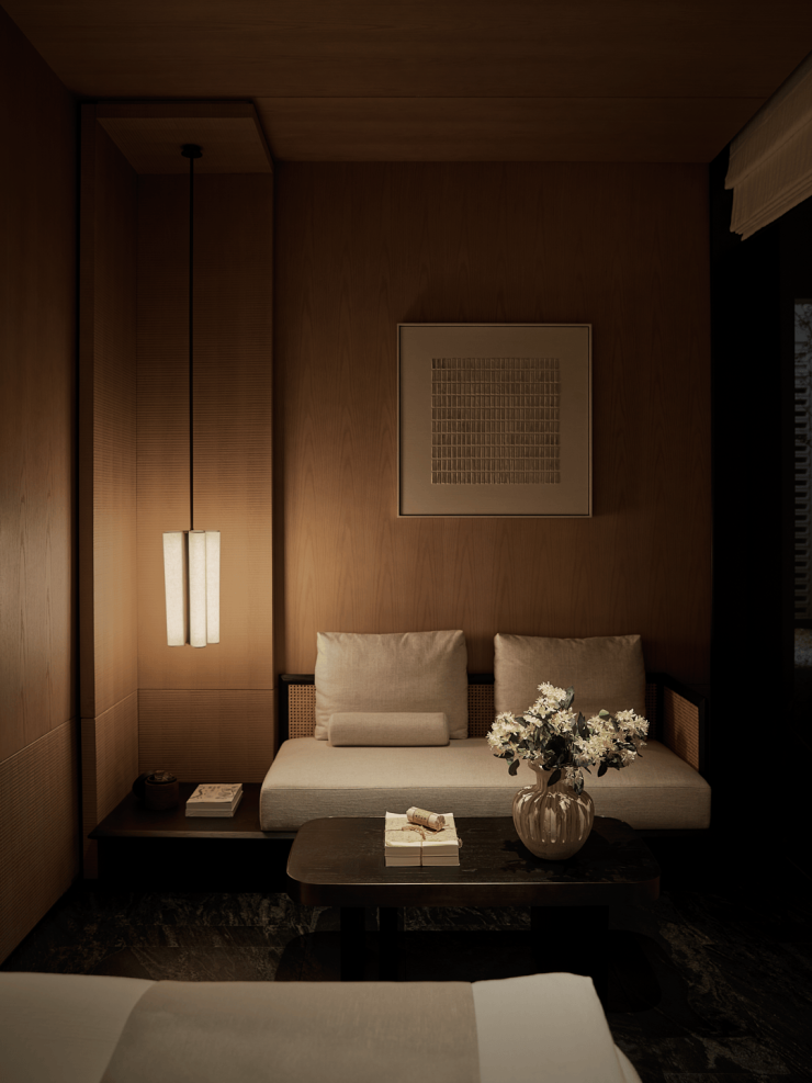 茶室以素朴为语,天然材质与细腻光影交织出一室清寂。榻榻米上竹帘筛光,茶香氤氲,时间在此变得柔软。相邻的棋牌室则缀以几笔跃动的红,于沉稳中透出几分鲜活生气,严肃与闲趣在此和谐相融,勾勒出完整而丰盈的生活意趣。