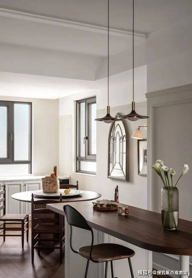 ▲ 复古铁艺镜子将光影摆弄,餐边柜里的面包砖增添质朴感,与木质结合自然从容,营造愉悦、肆意的用餐体验