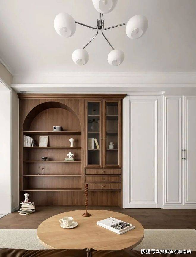 ▲ 取消电视以半开放式弧形书柜结合沙发、地毯打造功能型阅读客厅,引导家人享受亲子互动的乐趣