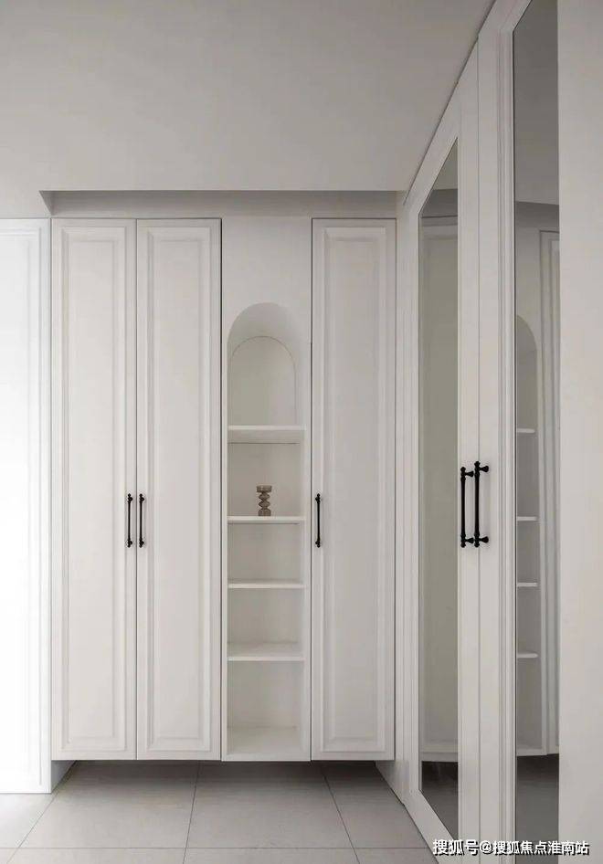 ▲ 玄关,通过调整老人房的门洞和内部卫生间的布局,实现双面柜体设计,拥有业主需要的储物间(右侧门后),形成一个成熟的收纳系统