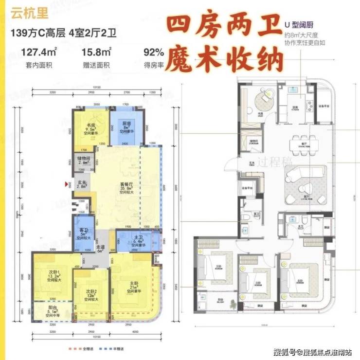 建面约139㎡:四房两厅两卫,大横厅设计,空间利用率高,满足多口之家需求。
