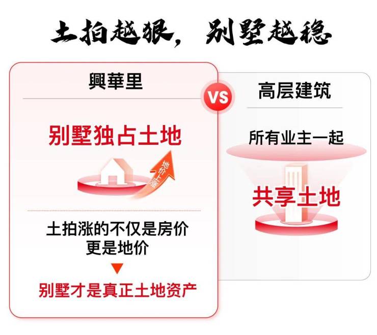 高层「竖向共享土地」,土地增值需高层住户均分;而别墅「横向独占土地」,土地增值独占。