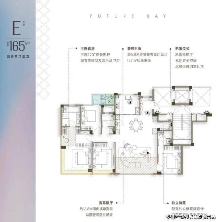 约165方户型,16.85米超大南向开间,超过市场所有同面积段产品;标配储藏间。