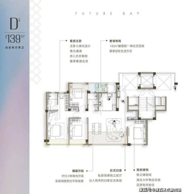 约139方户型,4.5开间朝南+储藏间,南向15.9米超大采光面,做到五开间朝南的空间,标配储藏间,三个南向卧室设计。