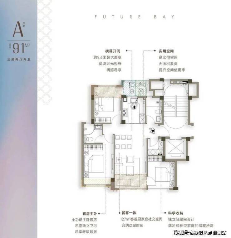 建面约91方真三房户型,真南北通透洋房产品北侧无消防连廊设计,小面积也是真南北通透,区别市面2+1户型,最小的卧室也有将近9个平方,每个卧室面宽均达到3米及以上全能收纳王入户标配储藏间,同时三个卧室均预留了衣柜区。108方户型布局差不多,但北面多一个房间。