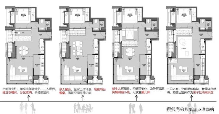 自由灵活平面下的超前创新户型,移门移动柜创造出的可变次卧,适应了不同时间段的家庭结构(派对模式、二人世界、三口之家)和相应的生活场景。