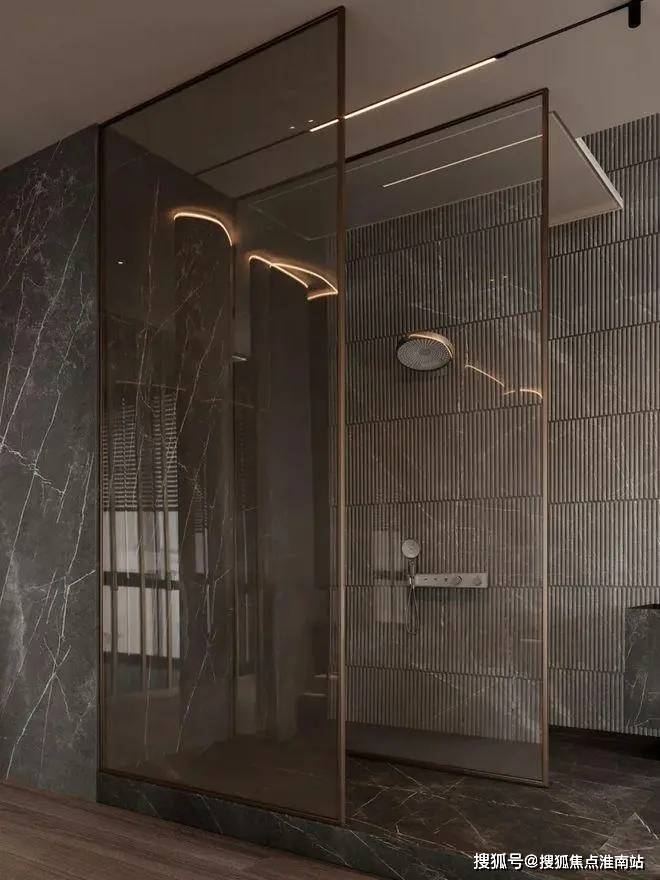 深色的玄关加上深灰色的墙面,让整个空间变得神秘又迷人。暗黄色的灯光给整个空间带来一丝神秘,客厅的视野完全被落地窗全部打开,整个空间显得通透大气。