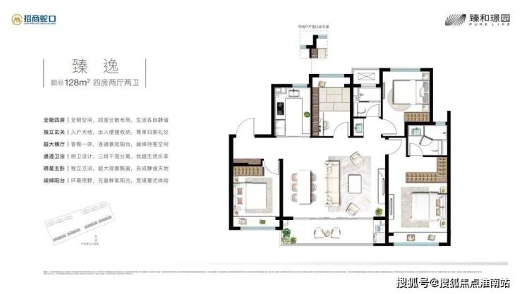 建面约128㎡户型,四开间朝南,开间约6.3米大横厅外接等宽阳台,主卧面宽高达约3.7米,加上同宽飘窗,尺度舒适。
